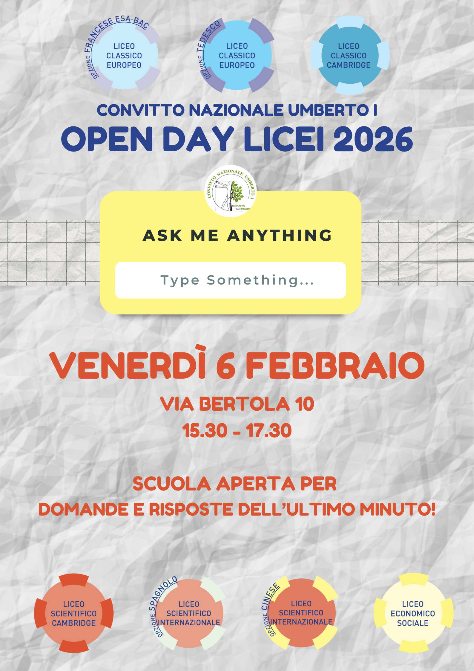 Venerdì 6 febbraio 2026 la sede di via Bertola 10 sarà aperta ad accesso libero dalle 15.30 alle 17.30: alcuni docenti del liceo saranno a disposizione per rispondere alle domande dei genitori e chiarire eventuali dubbi e perplessità.